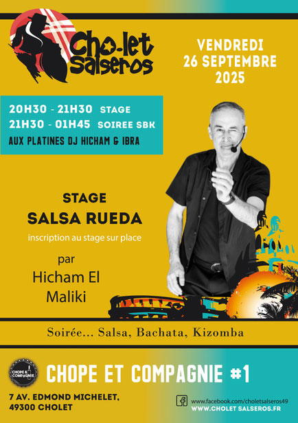 On se retrouve vendredi 26 septembre 2025 au Chope et Compagnie Cholet pour la première soirée de l'année avec Hicham pour un stage de SALSA RUEDA et avec Ibra Chavez aux platines! 🎉😜🔥💃🕺
