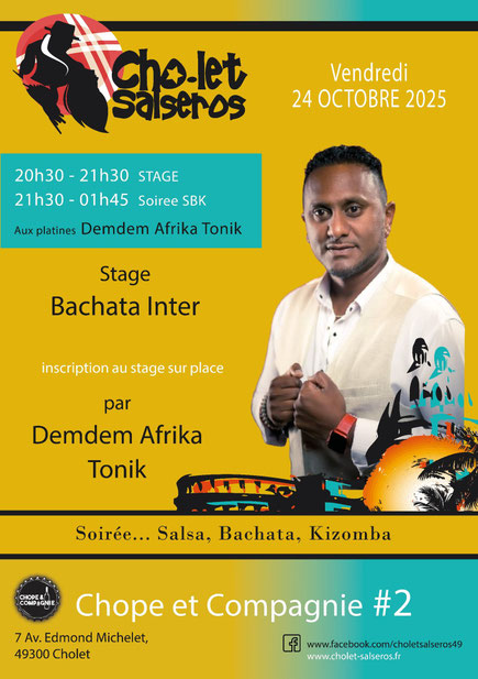 On se retrouve vendredi 24 Octobre 2025 au Chope et Compagnie Cholet avec Florent Demdem Afrika Tonik pour un stage de Bachata inter et aux platines! 🎉😜🔥💃🕺